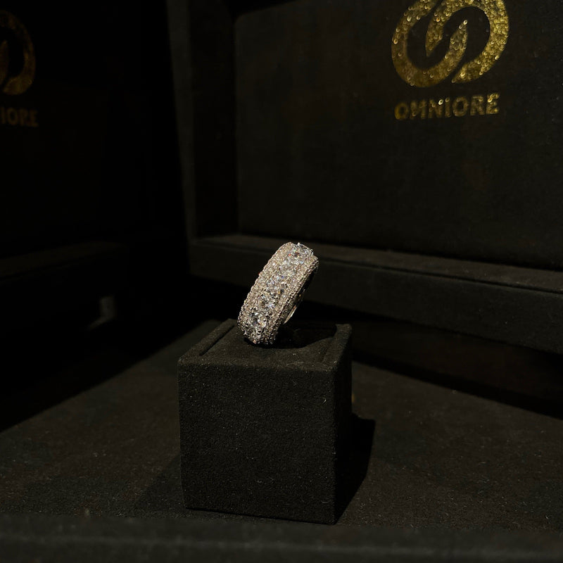 The Layered 360 Band Ring is a completely iced out Ring. Central Large stones surrounded with smaller stones create a wonderful shine. One of our most popular rings ! Can be worn on a casual day , for a clean look but can also be layered with other rings to create An amazing set .