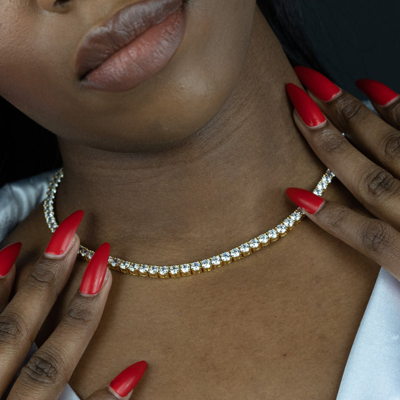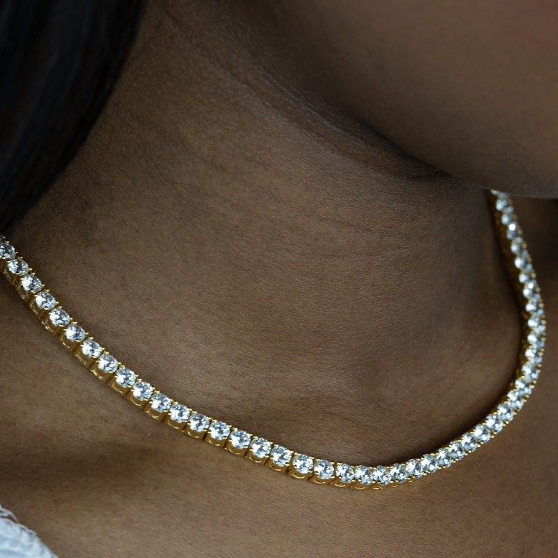 The Gold 4mm Round Cut Tennis choker is part of our gold collection, and is specifically built for female necks. This is definitely a piece you can not go wrong with. Lighting up your outfit for any occasion. Stacked or solo, it will take your outfit to that next level!