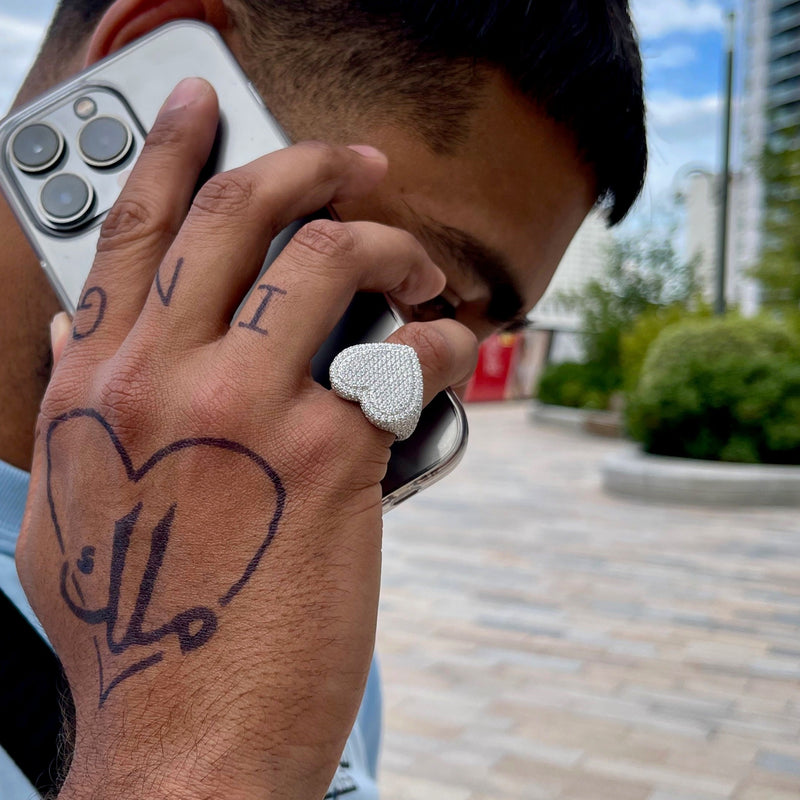 Heart Season is Here ! This ring is Pure Vibes , Full Silver Version, with all Handset 5A Flawless CZ Stones , the shine is incomparable. Iced all the way Round , this Piece is a must have .